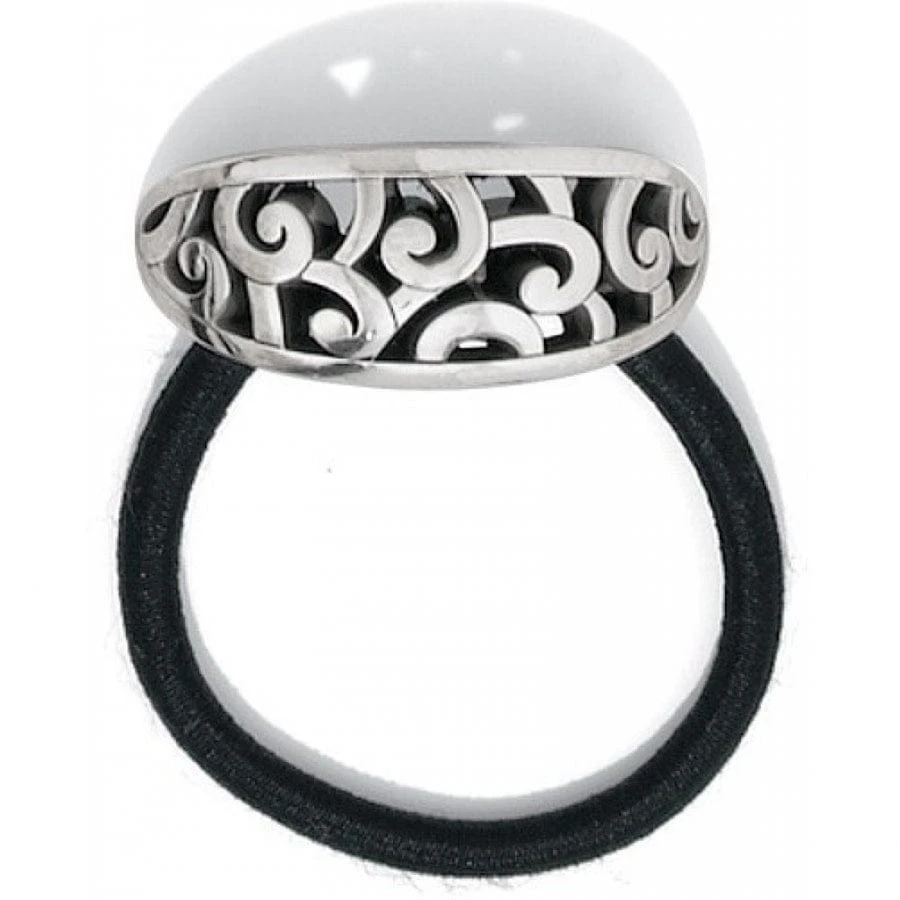 Add a decorative touch to your ponytail with whimsical scroll piercing on a smooth silver surface.